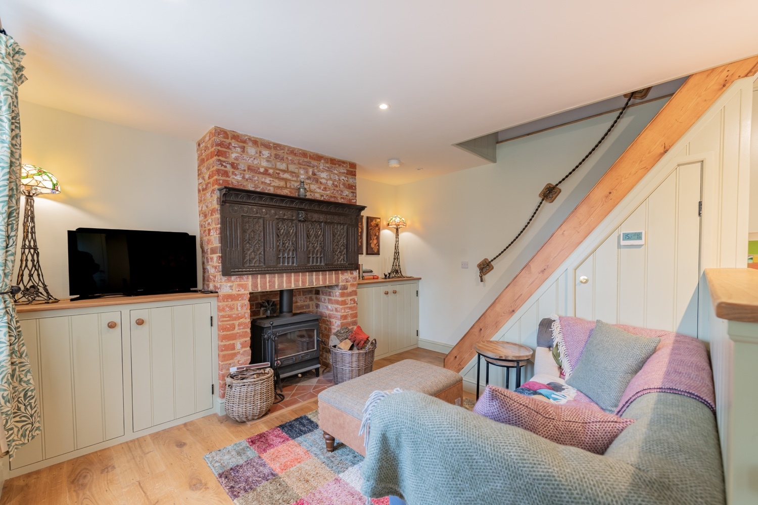 A cosy space with a sofa, ottoman, wood burner, TV, board games and books