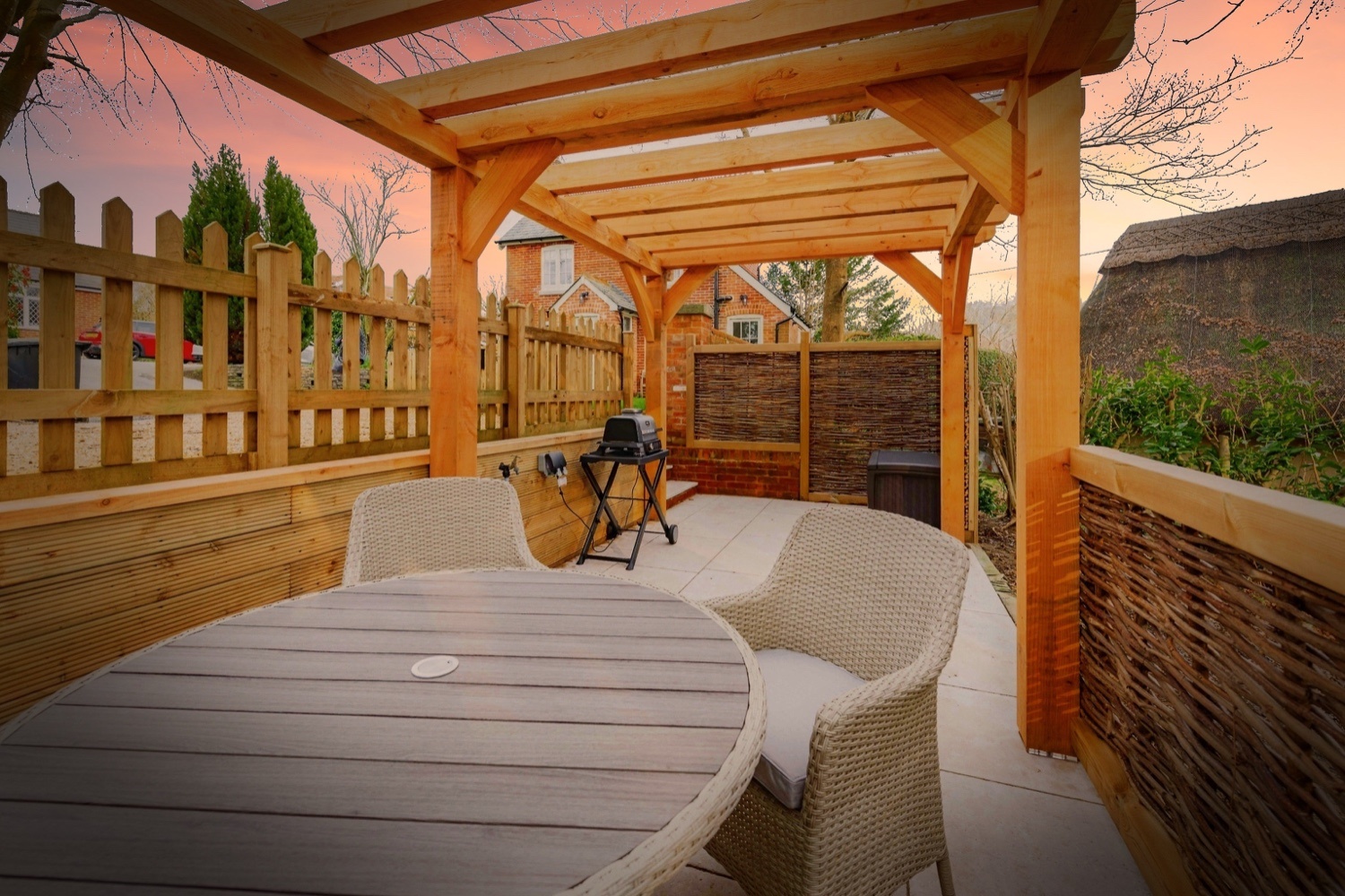 A beautiful pergola with furniture and a Ninja Wood Fire BBQ, smoker, and grill